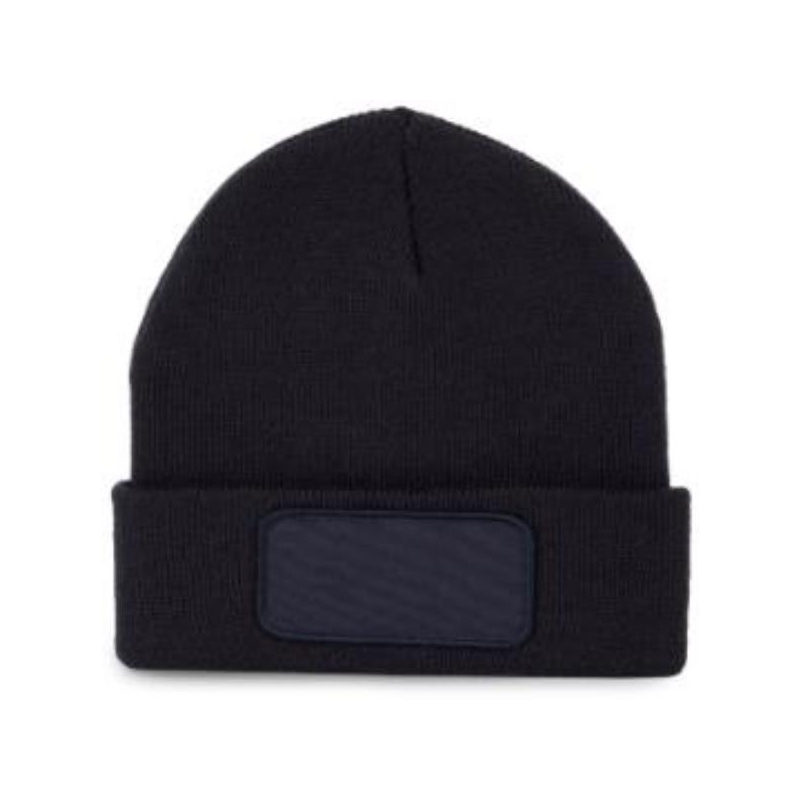 Bonnet KP895 avec patch de marquage. 100% acrylique. Bonnet tricoté avec revers en acrylique doux. Patch (10 x 5 cm) en coton sur le devant pour une personnalisation facile. coloris : noir