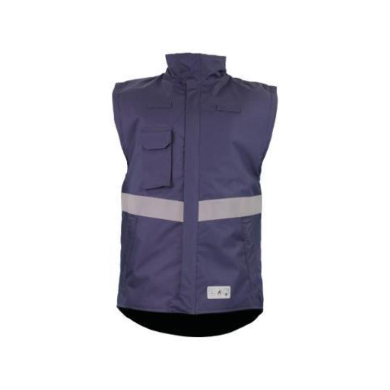 Gilet de froid ANDREA multinormes - Atex. Col cheminée. 2 poches basses latérales sous rabats, fermées par glissières injectées plastique. 1 poche téléphone à soufflet sous rabat auto-agrippant sur poitrine côté droit. 1 poche portefeuille intérieure sur doublure côté cœur. Brides pour détecteurs sur poitrine gauche et droite. Fermeture centrale par glissière mailles injectées plastique à double tirette de 6 mm de marque YKK® sous rabat fermé par pressions plastique permettant d’adapter ce blouson à l’intérieur de la parka ATHENA. Dos long protège reins. System KIT permettant d’adapter ce blouson dans les parkas et vestes de la gamme CHATARD. Trappe de marquage intérieur Easy Mark. Tailles : S à 3XL (tailles supérieures et sur-mesure sur demande). Fermetures à glissières et tous accessoires en plastique non conducteurs. MICROTEX FRAS : Tissu extérieur multinormes imper respirant - ignifugé - antistatique et résistant aux projections de produits liquides chimiques. Poids : ± 300g/m2. Doublure chaude matelassée en toile coton et ouate polyester traités retardateur de flamme. Bandes rétro réfléchissantes microbilles retardateur de flamme Rethiotex® Réf. 29535 certifiées pour 30 cycles de lavage industriel
