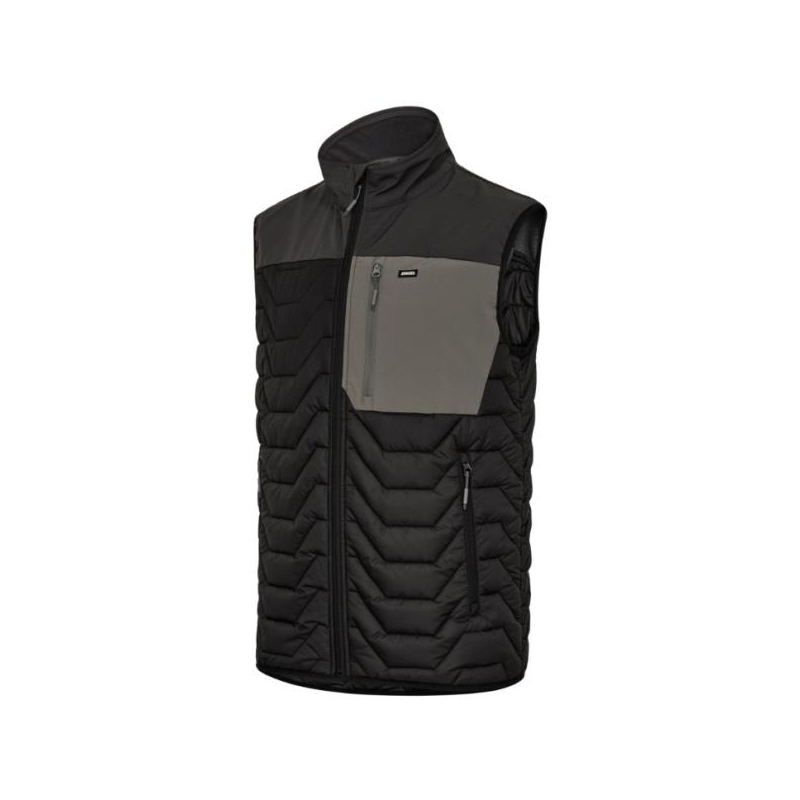 Gilet bi-matière matelassé /softshell, Engel Gamme ENTIRE 5328 Ecoresponsable. Tissu 100% polyester recyclé 70Gr/m² combiné à un tissu softshell avec traitement déperlant Bionic Finish Eco. Col intérieur doux et coupe vent. Fermeture éclair à l'avant. Poche poitrine zippée. Deux poches latérales zippées pour un rangement pratique. Bande de bordure élastique au col, aux emmanchures et en bas. Imprimé réfléchissant sur le col pour une meilleure visibilité. Coloris : Noir/Gris, Blanc/Gris, Deep bleu/Dark sea ( Marine/Ciel), Vert forêt/Noir, Anthracite/noir. Taille : XS à 6XL. Normes : OEKOTEX 100