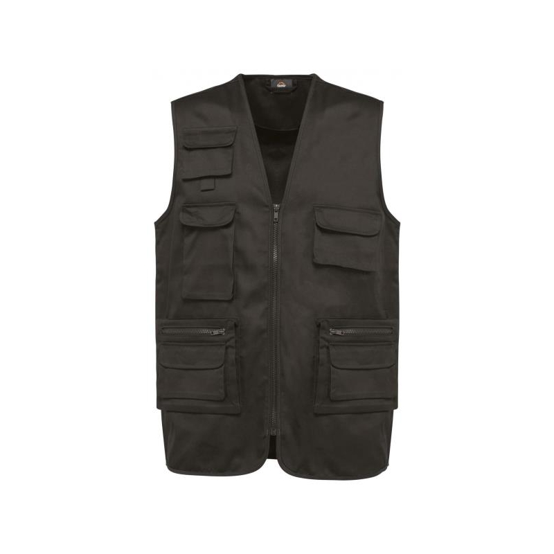 Gilet polycoton multipoches doublé unisexe WK609 WorkWear 190G/m². Composition: Extérieur 65% polyester / 35% coton - Doublure 100% polyester. Coupe ajustée. Doublure maille filet sur la moitié du dos. 2 doubles poches plaquées à soufflet avant dont 1 à rabat et 1 avec zip plastique ton sur ton. 3 poches plaquées à soufflet poitrine à rabat avec bande auto-agrippante de différentes tailles. Fermeture avec zip plastique ton sur ton. Lien d'accrochage intérieur col. Dos légèrement rallongé. Biais de finition ton sur ton à l'emmanchure et en bordure de vêtement. Etiquette nom à l'intérieur du vêtement. Coloris: beige, marine, gris anthracite, noir, kaki. Tailles: XS au 5XL